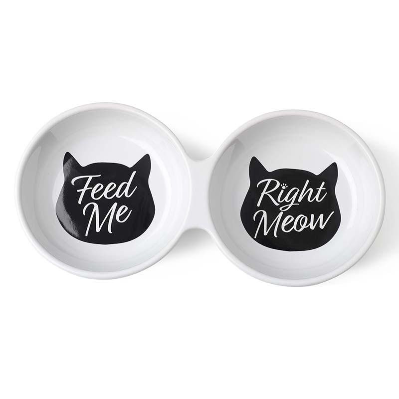 Meow Kitty, 10” duo diner in White has two connected bowl basins with 1 cup capacity each. The left bowl has a cat head silhouette with “Feed Me” scripted inside. The right bowl has a cat head silhouette with “Right Meow” scripted inside.